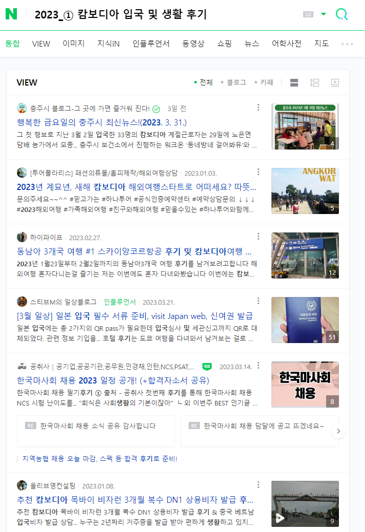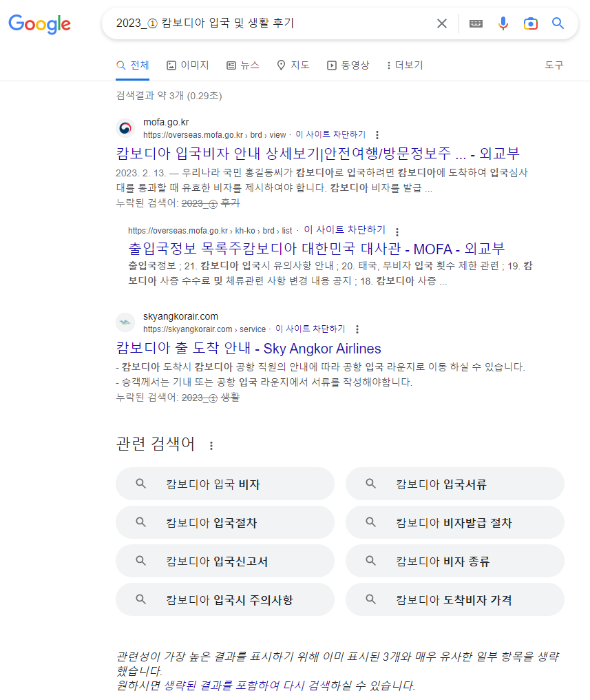 실제로 제가 올린 글들 중 가장 첫 글인 '2023_① 캄보디아 입국 및 생활 후기'를 네이버, 구글, 다음에 검색했을 때, 다음에서만 검색이 되는 것을 확인했습니다.
