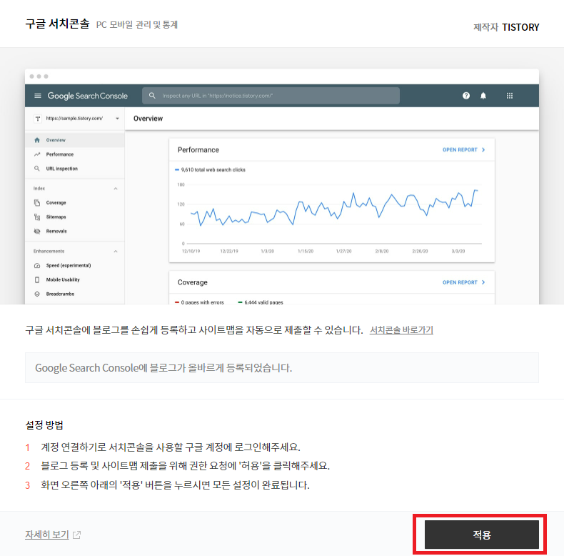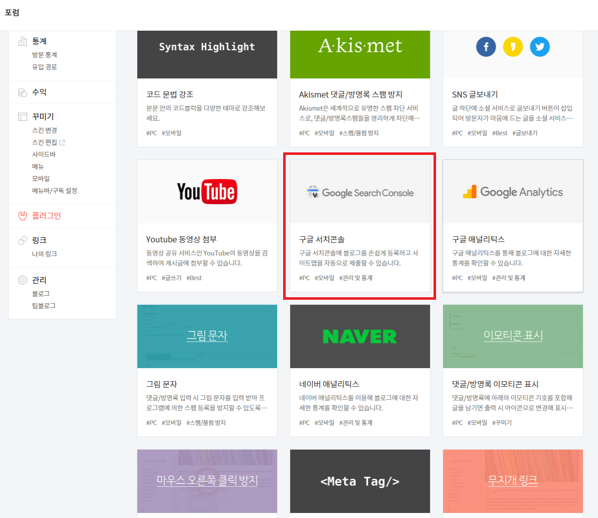 ① '티스토리 블로그 관리 페이지 > 플러그인' 화면에서 '구글 서치콘솔' 클릭