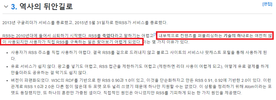 RSS 기술 자체는 쇠퇴하고 있는 듯 한데, 여기서 눈에 띄는 점은 '내부적으로 컨텐츠를 퍼블리싱하는 기술의 하나로는 여전히 많이 사용된다'는 문구입니다. 아마 구글, 네이버와 같은 검색 엔진이 검색하는 과정에서 RSS 기술을 계속 사용하고 있는 것으로 보입니다.