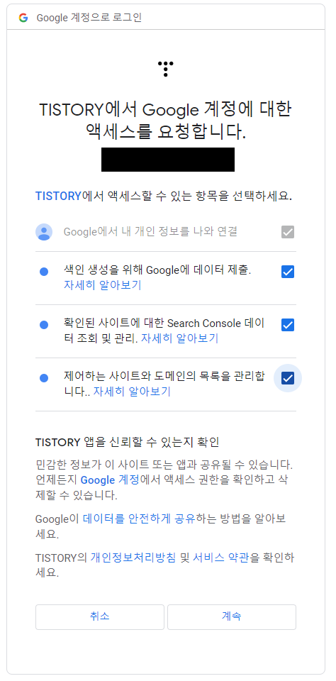 ④ 모든 항목 체크 후 '계속' 버튼 클릭