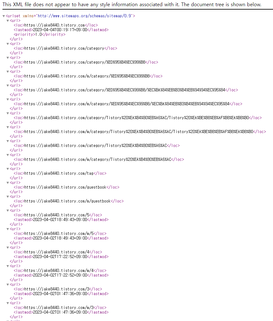 음.. 이 설명만 봐서는 정확하게 모르겠습니다. 아무래도 사이트맵 파일을 직접 봐야 알 수 있을 것 같습니다. 티스토리의 사이트맵을 등록하는 url이 블로그 url 뒤에 /sitemap.xml을 붙인 거였는데, 티스토리에서 자동으로 sitemap 파일을 생성해주는 것 같습니다. 한 번 입력해볼까요? 'https://jake8440.tistory.com/sitemap.xml'