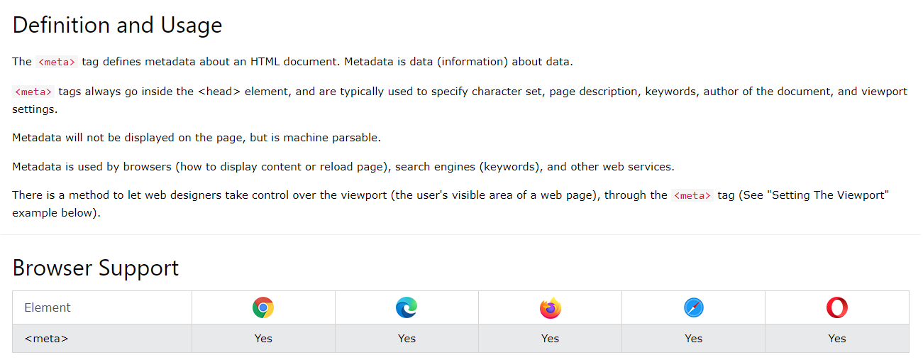 요약하면 메타 태그는 '검색엔진과 기타 클라이언트에 페이지에 대한 정보를 제공하기 위한 HTML 태그'라고 합니다.메타 태그는 항상 <head> 섹션 안에 있어야 하며, HTML 파일의 캐릭터셋(인코딩 방법), 설명, 키워드, 저자 등등 각종 정보를 제공한다고 합니다. 화면에는 표현되지 않고, 브라우저나 검색 엔진 등에서 쓰인다고 적혀있습니다. 즉, 화면에는 보여지지 않지만, 브라우저나 검색엔진에게는 제공되는 숨겨진 정보라고 볼 수 있겠습니다. 요즘 스마트폰으로 사진을 찍으면 사진을 언제, 어디서 찍었는지 숨겨진 정보를 갖고 있는 경우가 많은데, 이거랑 비슷한 개념이라고 보시면 되겠습니다.
