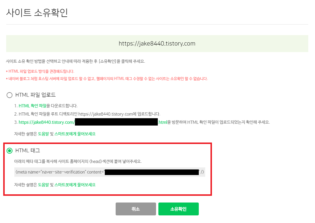 아래의 검은 부분들은 사람마다 고유한 정보인 것 같아 보이지 않게 지웠습니다. 아래 메타 태그를 복사해서 제 홈페이지의 <head> 섹션에 붙여 넣어달라고 하네요.
