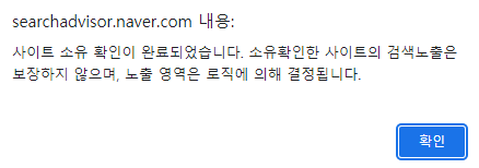 메타 태그를 정상적으로 등록했다면, 아래와 같은 안내 메시지 창이 뜹니다.