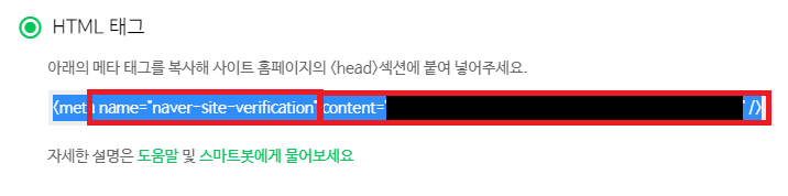 위에 사이트 소유확인을 위해서 'HTML 태그'를 선택했었는데, 그 메타 태그의 내부를 보면 'name'과 'content'라고 있을 겁니다. 이 항목들을 태그의 '속성' 값이라고 부릅니다. 속성 값 뒤에 '=' 기호와 함께 따옴표 안에 값이 있는데, 이 값들이 속성값입니다. 제 meta 태그는 'naver-site-verification'이라는 'name'의 속성과 '개인 정보라 까맣게 처리한 숫자'의 'content' 속성을 가지고 있는 것입니다.