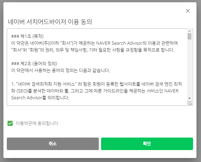 ① 네이버 서치어드바이저 접속 후, 우측 상단의 '웹마스터 도구' 접속 및 이용 동의(최초 접속 시에만)