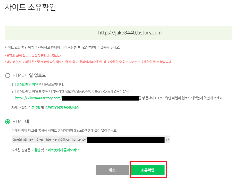 본인의 블로그 URL을 입력했으면, 아래와 같이 사이트가 본인 것이 맞는지 확인 요청을 합니다. 두 가지 방법이 있는데, 첫 번째 'HTML 파일 업로드' 방식은 제가 서버에 직접 접속해서 거기에 HTML 파일을 업로드 할 수 있을 때 사용하는 것 같습니다. 저희는 티스토리 서버에 직접 HTML 파일을 업로드 할 수 없기 때문에 두 번째 방법인 'HTML 태그' 방식을 사용할 겁니다.