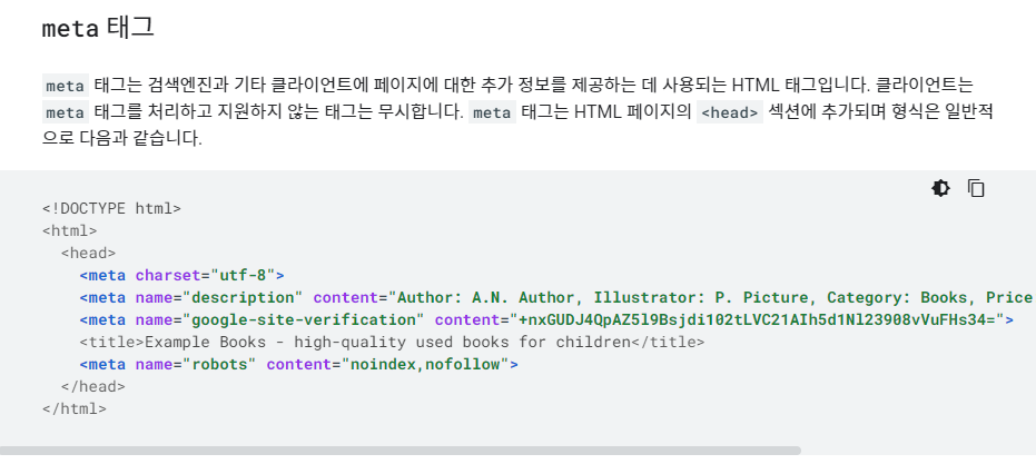 여기까지 보셨다면 HTML의 개념과 HTML 태그, <head> 섹션이 무엇인지는 대충 아셨을 겁니다. 그렇다면 '메타 태그'란 무엇일까요? 이번에도 구글 검색 센터의 힘을 빌려봅니다.