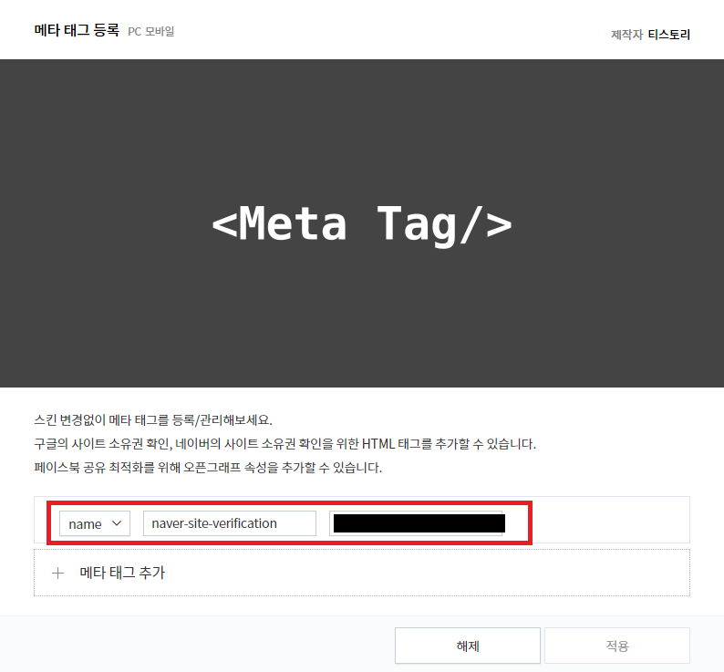'메타 태그 등록 플러그인'을 클릭하면 '메타 태그 추가'가 가능한데, 이것을 눌러 아래와 같이 채우고 '적용' 버튼을 눌러줍니다.