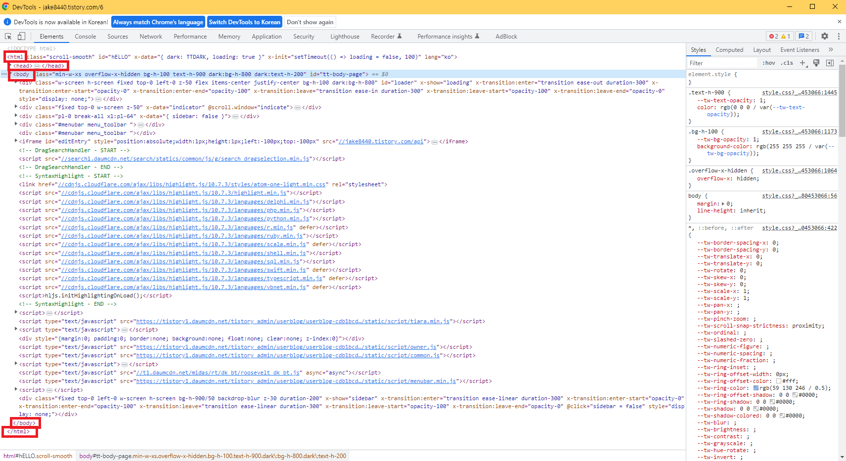 HTML에서는 이 태그를 이용해 문서를 구조화합니다. 문서 위쪽은 <head>로, 문서 아래쪽은 <body>로 나누고, 이 모든 내용물은 <html> 태그 안에 들어있죠. 한 번 두 눈으로 직접 확인해볼까요? PC의 크롬 브라우저로 제 글을 보고 계신다면, F12 버튼을 눌러 개발자 도구를 열어보세요.(DevTools) 개발자 도구에서 'Elements'를 클릭하시면, 지금 보고 계시는 게시글을 표현하고 있는 HTML 문서를 확인할 수 있습니다. 저는 이전 글인 구글 서치콘솔 글을 확인해봤습니다.