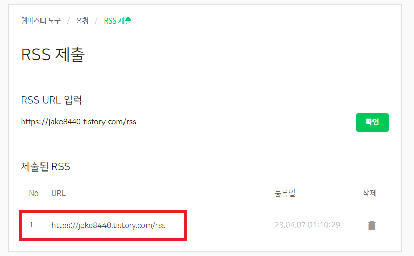 RSS 제출과 사이트맵 제출 화면에서 각각 RSS와 사이트맵 URL을 등록해줍니다.