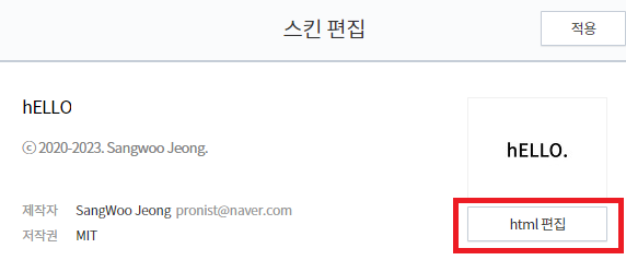 티스토리 블로그관리 메뉴 중 '스킨 편집'을 누르실 경우, 아래와 같이 'html 편집'이라는 버튼을 볼 수도 있죠. 이는 즉, html로 구성되어있는 스킨을 제 마음대로 편집하겠다는 뜻입니다.